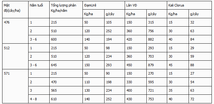 Bảng: Liều lượng phân hóa học bón cho cao su khai thác theo mật độ và năm khai thác