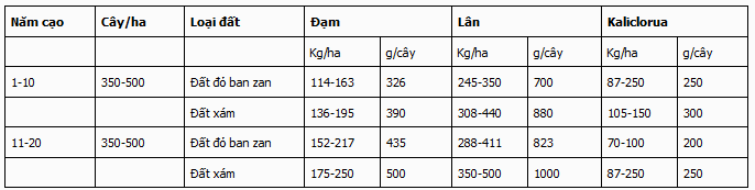 Phân vô cơ đươc chia làm 2 lần/năm, lần đầu bón 2/3 lượng phân N và K và toàn bộ lân vào tháng 4, 5 (đầu mùa mưa) khi đất đủ ẩm, lần hai bón lượng còn lại vào tháng 10.